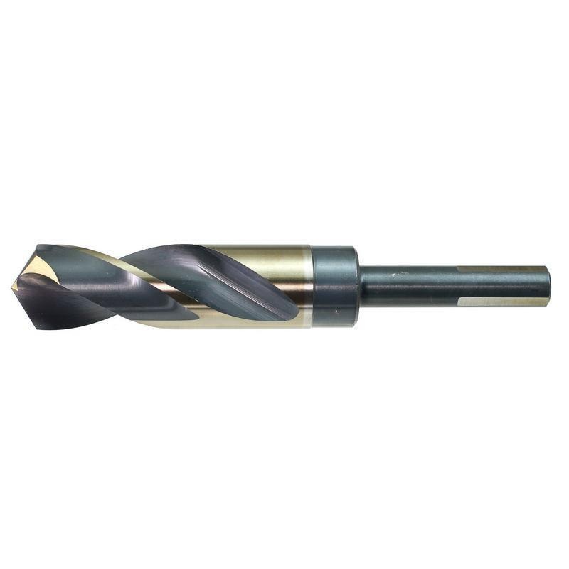 Are of general purpose flute design but all sizes have a 1/2 by 2-1/4 long shank. The maximum overall length is 6 and the flute length is 3. This makes them short drills in the larger sizes and thus well suited to use in portable electric drills equipped with 1/2 chucks. They are highly effective in tough, high tensile strength materials. The 135 degree split point reduces thrust and eliminates walking at the drill point.