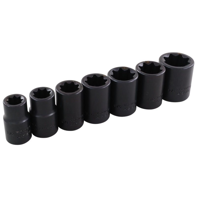 Contains Sizes: 3/8", 7/16", 1/2", 9/16", 5/8", 11/16", 3/4".Drive Type: 8 PointDrive size: 1/2"Corrosion resistant black oxide finish.Made of premium tool steel and precision heat-treated for maximum durability.Hex openings deliver maximum turning power w
