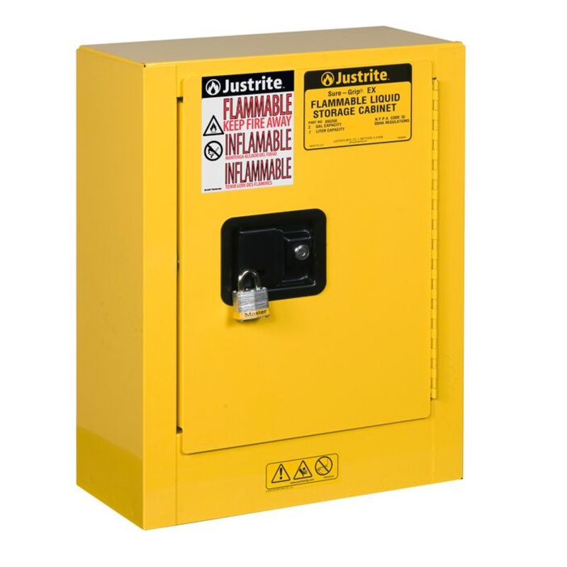 Protect workers, reduce fire risks, and improve productivity by storing flammable fuels and chemicals in code-compliant safety cabinets. Designed to meet OSHA and NFPA standards, Sure-GripEX cabinets are constructed of sturdy 18-gauge (1-mm) thick double-wall, welded steel with 1-1/2 (38-mm) of insulating air space for fire resistance.High-performance, manual-close, self-latching doors open to a full 180 degrees and close easily and securely for maximum protection under fire conditions when pushed shut. Fail-safe closing mechanism ensures three-point stainless steel bullet latching system works every time.