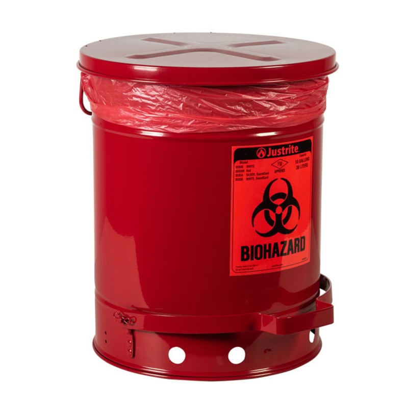 Justrites Biohazard Waste Cans meet OSHA 29 CFR 1910.1030 for the segregation of infectious waste. Use them to store contaminated laundry as well as other regulated waste; however, not for the storage of sharps. Sturdy steel cans feature leakproof construction with foot-operated, self-closing lid. Simple, foot pedal operation opens the biohazard waste can cover automatically to safely dispose of hazardous waste. Upon release of the pedal, the cover closes quickly to reduce the risk of contamination. Optional biohazard bag #05901 is held securely around the circumference of the can top.