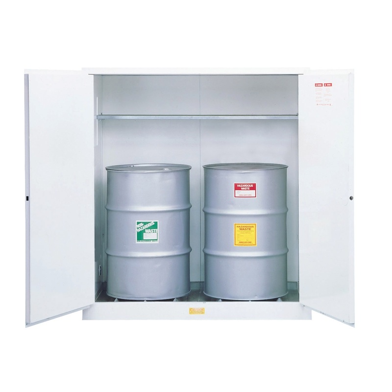 White Drum Cabinets for Flammable Waste are the solution for temporary on-site accumulation and storage of waste liquids. Vertical drum safety cabinets safely store waste awaiting pickup and disposal. Each cabinet includes a handy half-depth shelf for additional storage. Large warning label on outside doors identifies contents “Flammable Waste”.