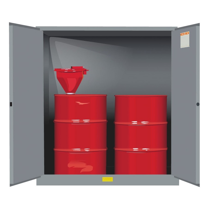 For storage of larger quantities of flammable solvents, the heavy-duty Drum Safety Cabinet isavailable in many styles and sizes. Built to the same high standards as the smallerClassicSafety Cabinets, areinforced liquid-tight sump contains spills. An array of drum accessories and equipment is available to ensure safety and convenience when storing and handling drums of hazardous materials.