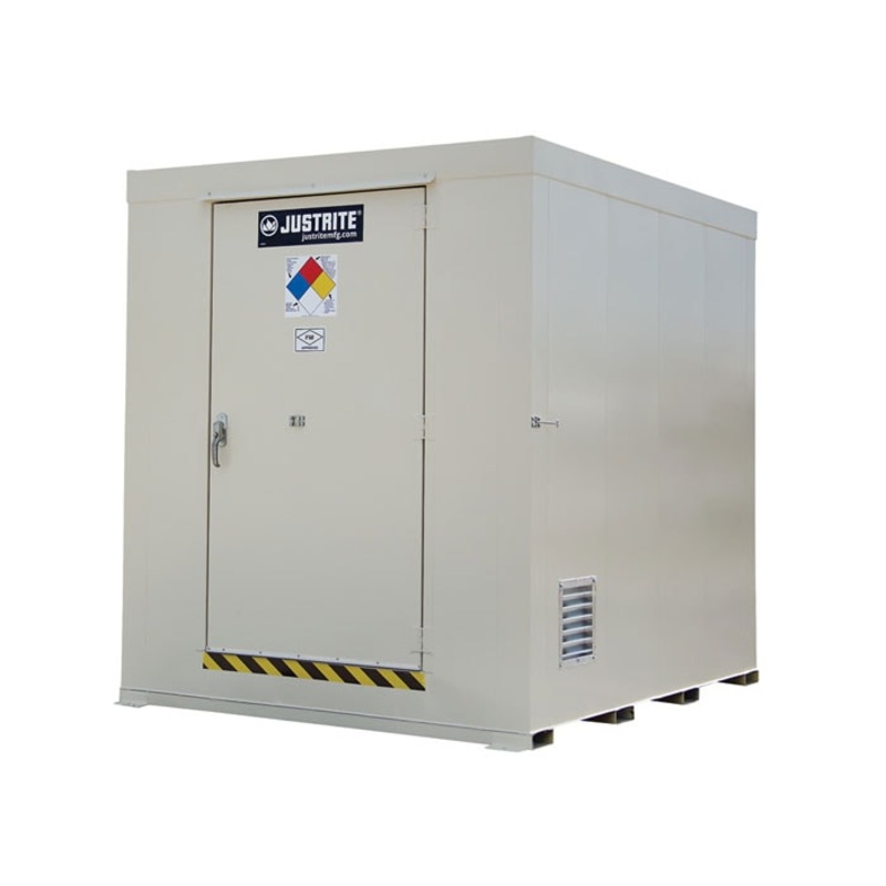 Each locker features natural draft ventilation, NFPA 704 diamond decal for content identification, anchoring plates for hold down protection, and multiple static grounding connections for maximum safety. Forklift channels permit easy relocation.