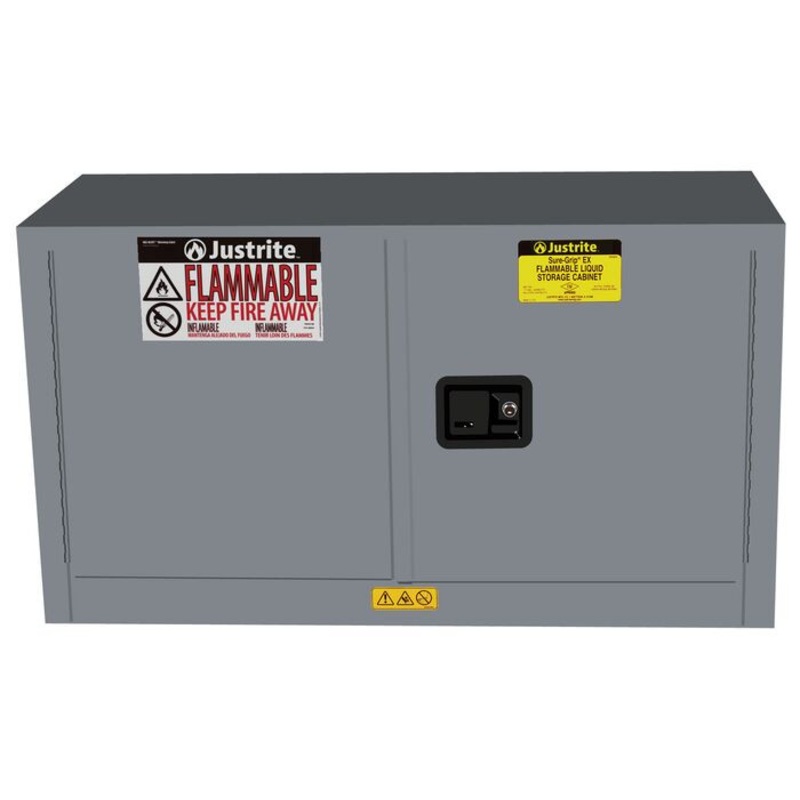Use independently on bench tops or stack on top of 30- or 45-gal (114- or 170-L) Justrite safety cabinets. It can also be mounted on a wall with an optional wall hanger assembly (model 25950).