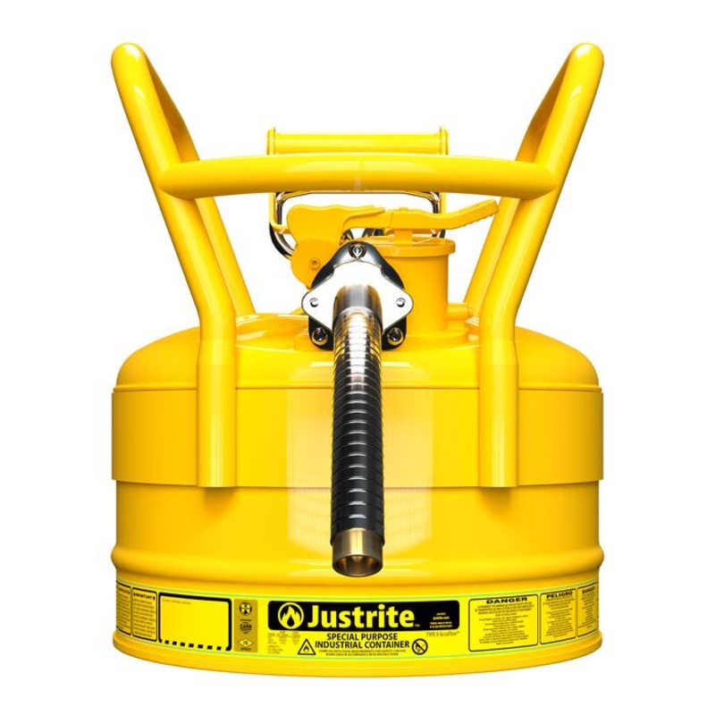 This safety can is made of steel, has an exterior height of 12.7 in (305 mm), an outer diameter of 11.75 in (298 mm), and the fill or pour hole is 1.68 in (43 mm). The accompanying metal hose is 9 in (229 mm) long and has an outer diameter of 1 in (25 mm). Model 7325230 weighs 10.3 lb (4.7 kg); and is one of four yellow DOT safety can options available from Justrite.