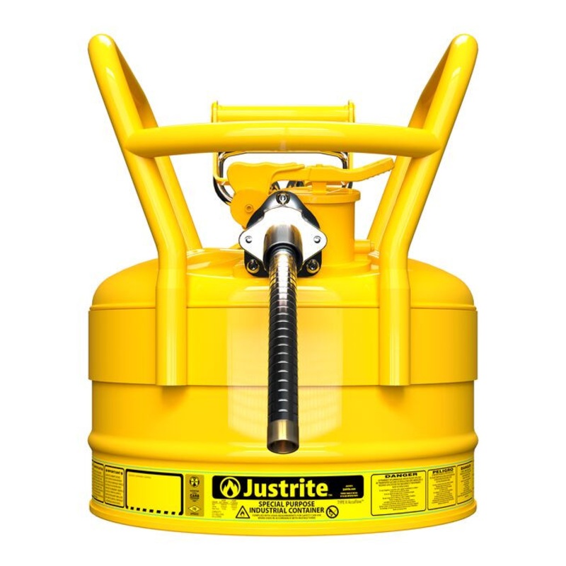 Use this trusted and reliable 2.5 gal (9 L) Justrite yellow DOT Type II Accuflow Steel Safety Can with Roll Bars (model 7325220) for over-the-road transport of diesel fuel and as a safety can for onsite fuel dispensing. Transporting diesel is required across many industries including, but not limited to, agriculture, construction, and mining.