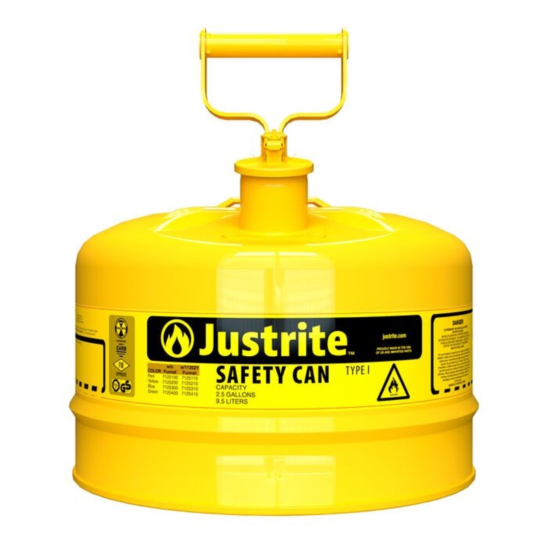 Made from high-grade coated steel, each can is tested to guarantee 100% leakproof construction. The tough powder-coat finish resists chemicals and stands up to demands of rigorous use. Each Justrite safety can is equipped with a stainless steel flame arrester which dissipates heat to stop flashback ignition. Cans up to 1 quart (1L) feature a trigger-release handle, while larger capacities have a swinging handle to greatly ease carrying of heavier loads.