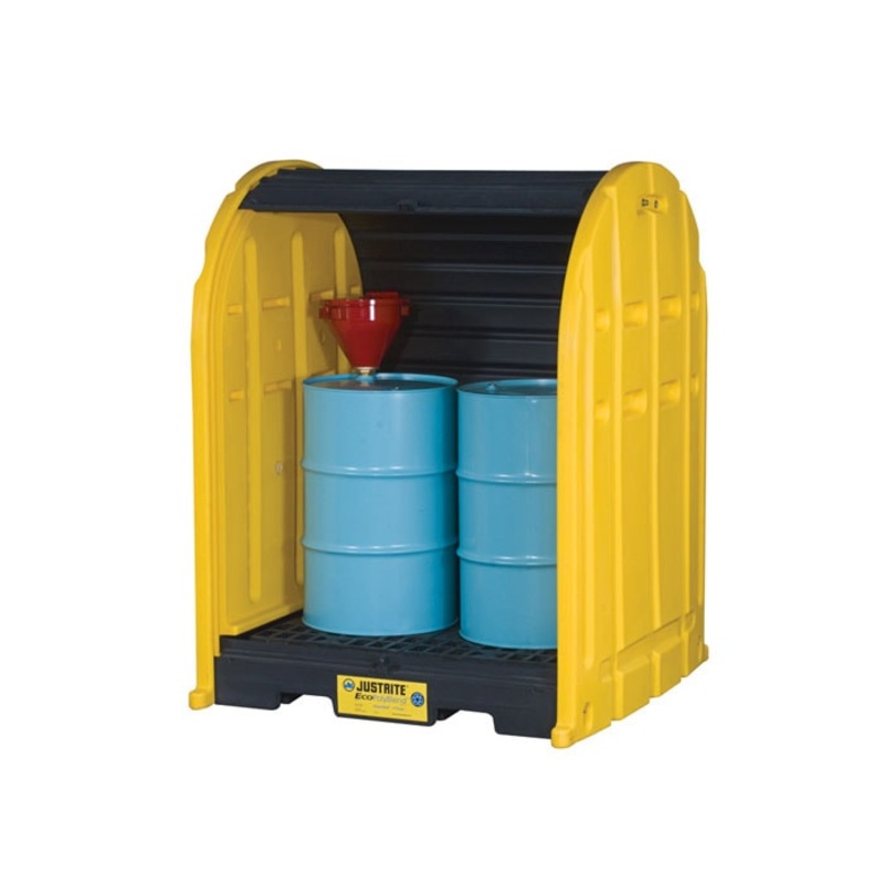 EcoPolyBlend DrumSheds feature a weather resistant, robust design made of eco-friendly 50% recycled polyethylene. Convenient roll top doors allow access from front or rear. Wide door opening of 52" accepts palletized loads. The leak proof pallet sump meets