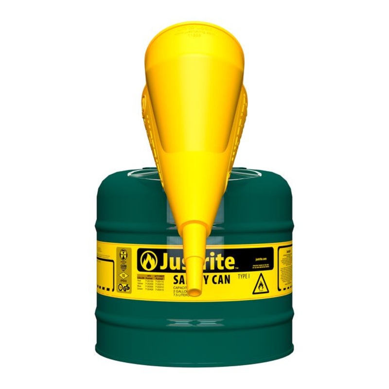 Use a Type I safety can funnel to pour into smaller openings. This polypropylene funnel attaches to the spout neck of Type I Safety cans that are sized 1-gallon (4L) and larger. The two-position funnel folds down for when you fill or store the can, and stays up for when you pour. Large rounded bowl provides protection from splashing and spillage. Durable construction holds up to heavy use.