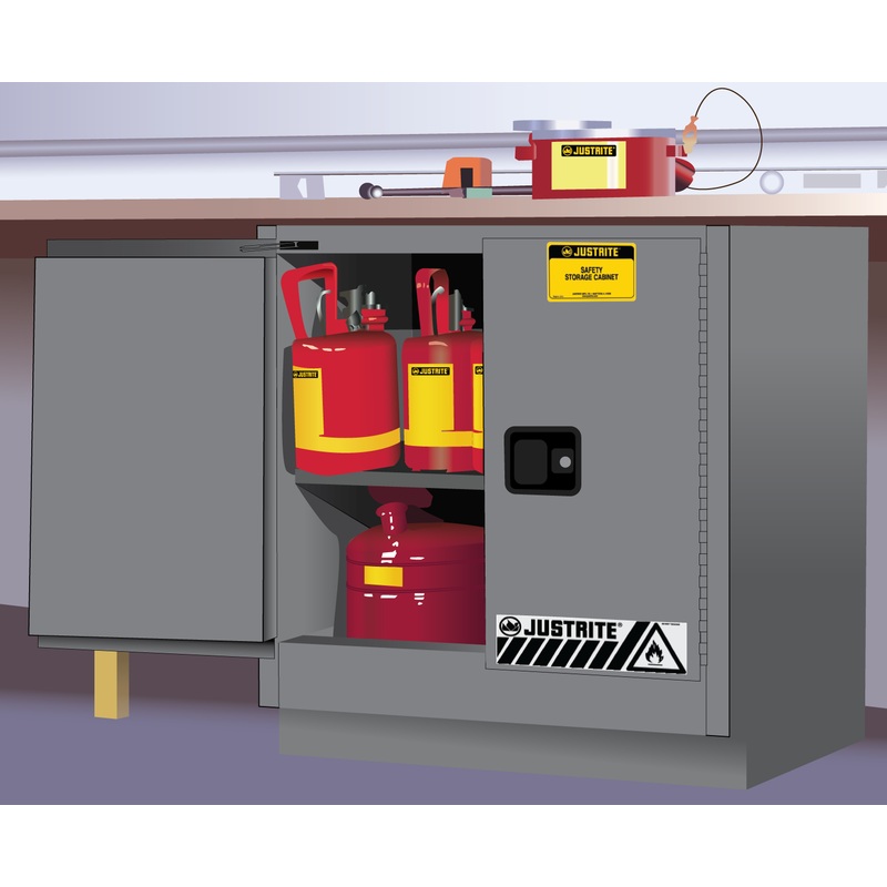 Conveniently locate flammable liquids near work areas, with the Justrite Sure-Grip Undercounter Safety Cabinet with Manual Close Doors (model 892303). It can be safely placed beneath countertops and work benches and features a 3.5 in H x 2.2 in D (89 mm H