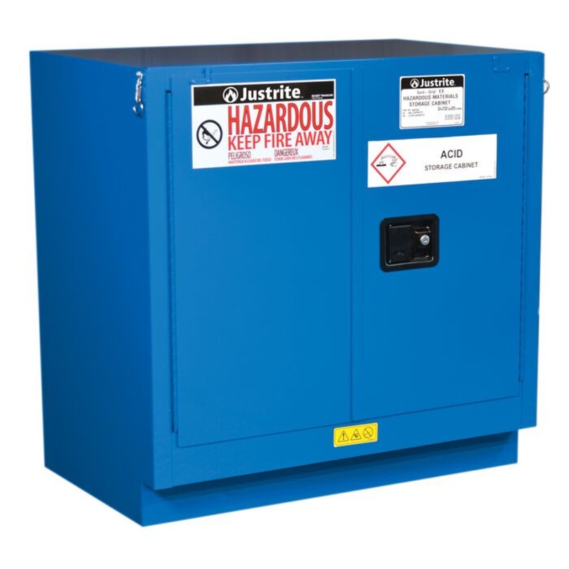 Safely storehazardous materialsunder a workbench or lab counter for quick and easy access with these Justrite Undercounter Hazardous Material Safety Cabinets, whichhave the same quality safety features as the cabinets for flammables. All models come with double-wall construction, dual vents, grounding wire connections, adjustable shelves, leakproof sills, three-point self-latching doors and leveling feet. Self-close door(s) shuts and latches automatically when a fusible link melts at 165F (74C) under fire conditions. Unique, concealed self-closing mechanism offers obstruction-free access to contents.