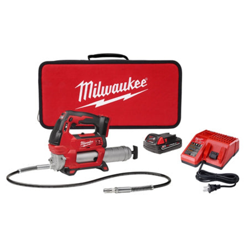 The M18 Cordless 2-Speed Grease Gun delivers maximum pressure and unmatched versatility, offering an industry leading 10,000 PSI max operating pressure and a patent pending pre-set grease counter that allows service and maintenance professionals to dispense precise amounts of grease. The tools 2-speed design offers users the ability to select between max pressure and max flow rate. Other unique features include an on-board LED light, a lock-on/lock-off trigger, and a plunger rod with markings to gauge how much grease is left in the barrel. The tools stand up design and shoulder strap capability offer user convenience, while limiting fatigue and the 48 flexible hose offers greater accessibility when greasing hard to reach fittings. The new tool is also compatible with a clear barrel accessory (49-16-2646). Powered by an M18 REDLITHIUM Battery pack, this is the industrys only 18V grease gun thats battery is compatible with a system of tools. The kit includes the new multi-voltage charger, so you can charge all M12 and M18 lithium-ion batteries with one charger.