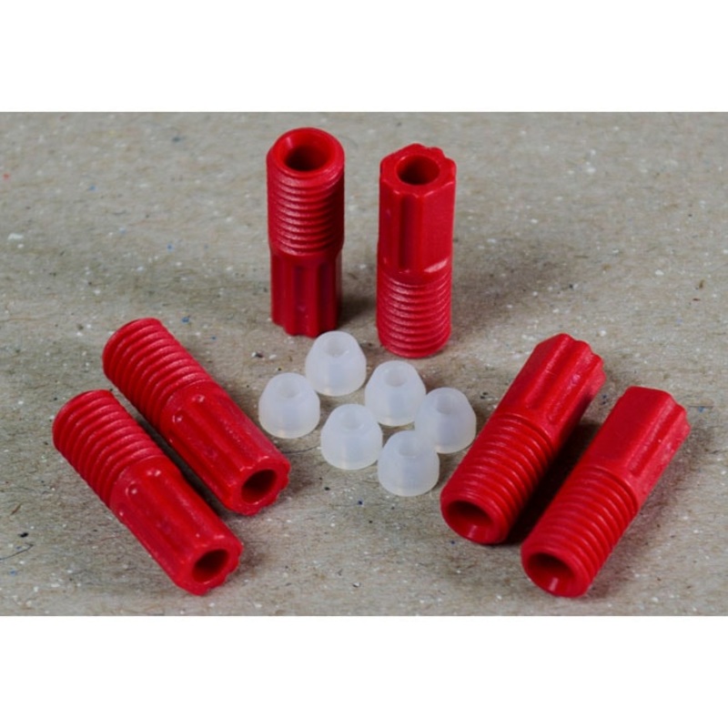 The compression fittings, sold in sets of six, accommodate hard-wall tubing size of 3.0-mm OD. The fittings are approximately 1" (25-mm) long and made of ETFE (ethylene tetrafluoroethylene) a fluorine based plastic. They include ferrules for a compression