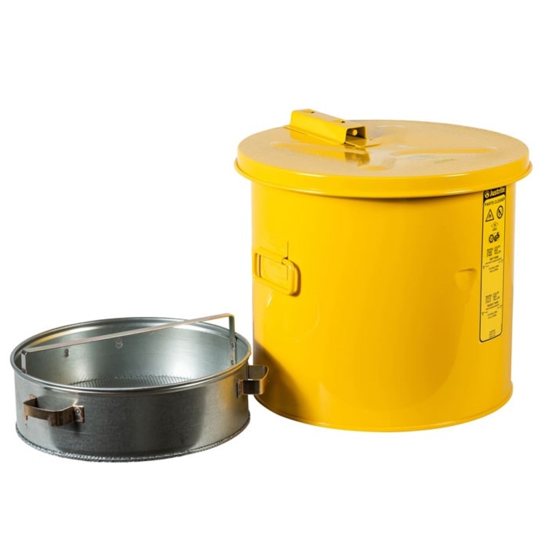 Wash Tanks are designed to simplify small parts cleaning. An integral parts basket facilitates washing quantities of small parts quickly. Both the can and basket are made of sturdy 24-gauge, lead-free coated steel. After cleaning, the basket is positioned at the top of the tank to allow solvent to drain. Cover is equipped with a self-closing mechanism and fusible link which melts at 165F (74C) to close the cover in case of fire.