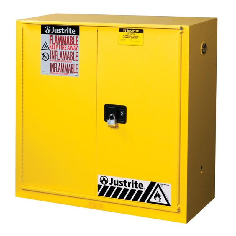 Protect workers, reduce fire risks, and improve productivity by storing flammable fuels and chemicals in code-compliant safety cabinets. Designed to meet OSHA and NFPA standards, Sure-Grip EX cabinets are constructed of sturdy 18-gauge (1-mm) thick double-wall, welded steel with 1-1/2″ (38-mm) of insulating air space for fire resistance. High-performance, self-latching doors close easily and securely for maximum protection under fire conditions. Fail-safe closing mechanism ensures three-point stainless steel bullet latching system works every time.