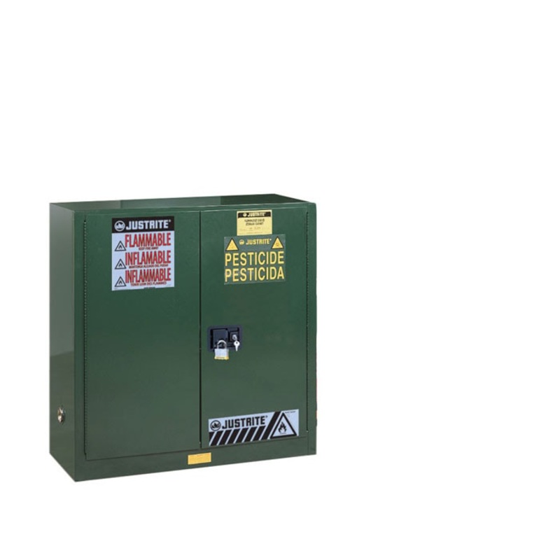 Pesticides present a substantial danger to people and the environment when improperly stored. Pesticide safety cabinets allow segregation of liquids stored at the worksite, eliminating the potential for drips and spills during the transfer of pesticides. Dissimilar pesticides stored separately prevent one from contaminating another or the accidental use of the wrong chemical.