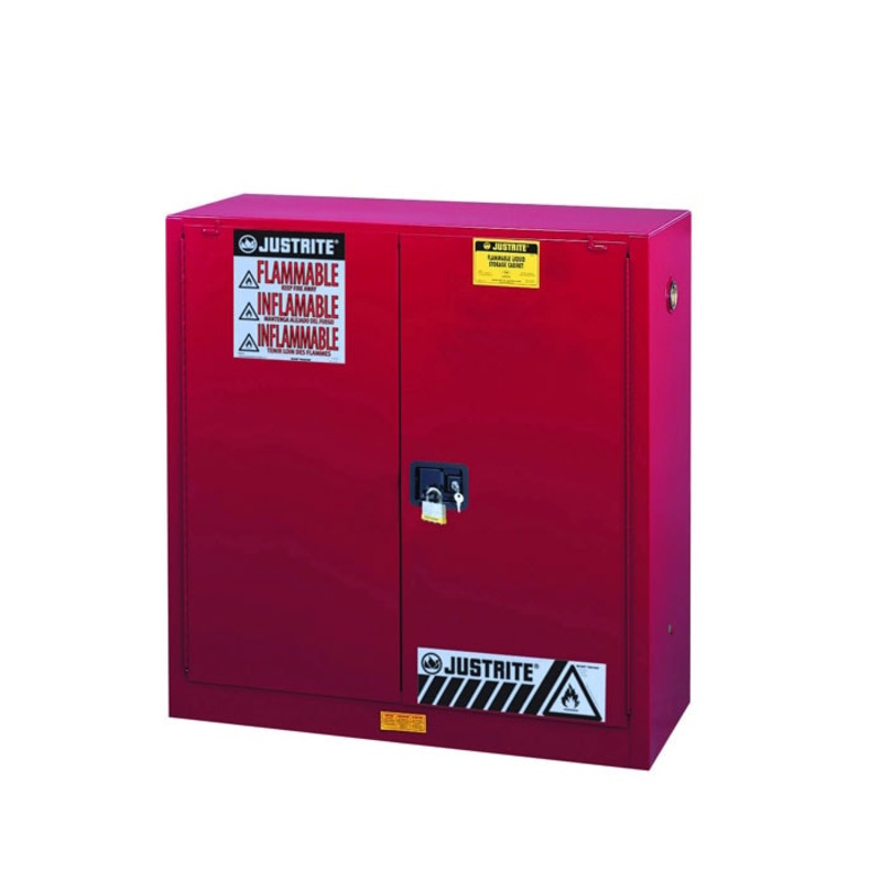 One of the leading causes of industrial fires is the improper storage and handling of flammable liquids. The Justrite Standard Sure-Grip EX Flammable Safety Cabinet with Self-Close Doors (model 893021) is designed to safely store flammable liquids. Its exterior dimensions are 44 in H x 43 in W x 18 in D (1118 mm H x 1092 mm W x 457 mm D). These red cabinets can store 30 gal (114 L) of flammable liquids.