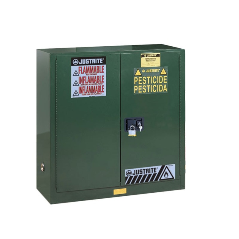 Pesticides present a substantial danger to people and the environment when improperly stored. Pesticide safety cabinets allow segregation of liquids stored at the worksite, eliminating the potential for drips and spills during the transfer of pesticides. Dissimilar pesticides stored separately prevent one from contaminating another or the accidental use of the wrong chemical.