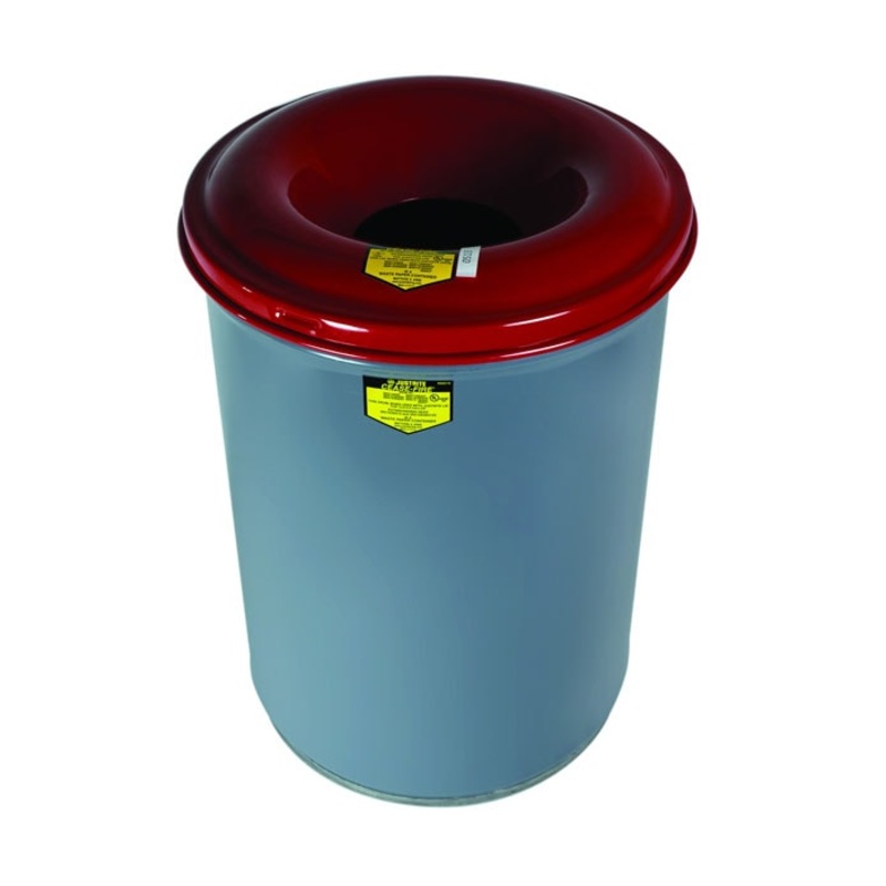 Justrites Cease-Fire Waste Receptacles are specially contoured to direct smoke and gas from any fire inside the container, back into the combustion area, cutting off the air supply and extinguishing flames in seconds. Use for the collection of waste paper and other solvent-free combustibles. Cease-Fire receptacles provide around-the-clock protection against trash fires and are suitable for use in plants, hospitals, schools, offices and stores. Drums should not be filled beyond 3/4 full.
