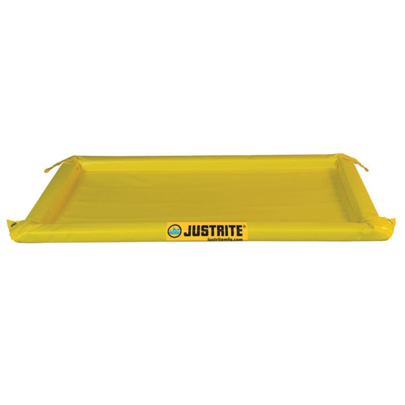 Quickly contain minor spills and leaks during temporary storage of drums, machine parts, batteries, and equipment. Lightweight EnGuardI, PVC coated fabric provides broad UV and chemical resistance. Anchor berm in place using the brass grommets in each corner. Anchor stakes not included. Order optional grates to keep products and machinery above fluid.
