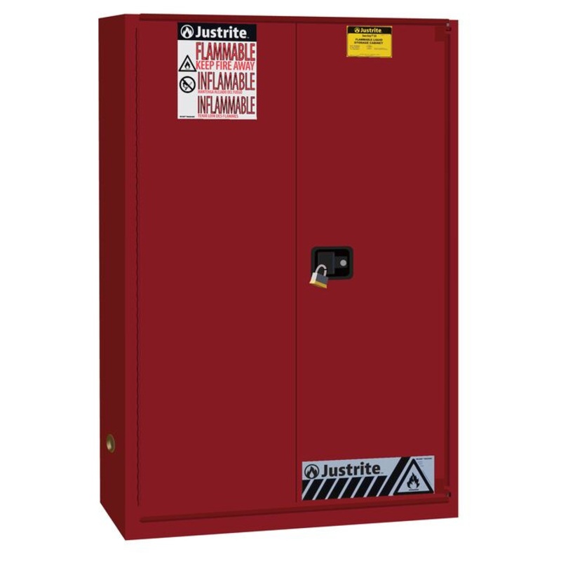 Protect workers, reduce fire risks, and improve productivity by storing flammable fuels and chemicals in code-compliant safety cabinets. Designed to meet OSHA and NFPA standards, Sure-Grip EX cabinets are constructed of sturdy 18-gauge (1-mm) thick double-wall, welded steel with 1-1/2″ (38-mm) of insulating air space for fire resistance. High-performance, self-latching doors close easily and securely for maximum protection under fire conditions. Fail-safe closing mechanism ensures three-point stainless steel bullet latching system works every time.