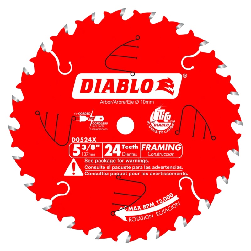 Diablo Cordless Framing blade is ideal for general construction applications, including fast, efficient ripping and crosscutting. Diablo’s blade cuts rough framing lumber, high quality finish lumber, plywood, OSB, and hardboard siding with the smoothest, fastest and most accurate cut. The thin kerf design requires less cutting power from the user and the saw for better control over the cut. Diablos unique design, extra-tough steel plate and proprietary carbide tips deliver longer life and frames more houses than other framing blades