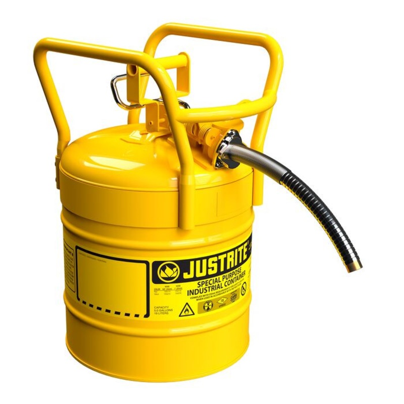 This safety can is made of steel, has an exterior height of 18.52 in (445 mm), an outer diameter of 11.75 in (298 mm), and the fill or pour hole is 1.68 in (43 mm). The accompanying metal hose is 9 in (229 mm) long and has an outer diameter of 1 in (25 mm). Model 7350230 weighs 12.5 lb (5.7 kg); and is one of four yellow DOT safety can options available from Justrite.