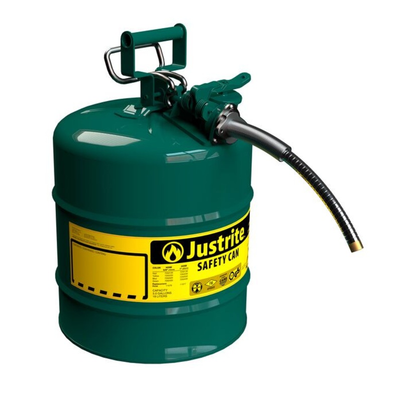 Experience the benefits of Justrite’s Type II AccuFlow safety cans available in several colors and suitable for the storage of flammable liquids. This helps identify specific liquids, and avoids costly errors when using more than one liquid at a worksite.