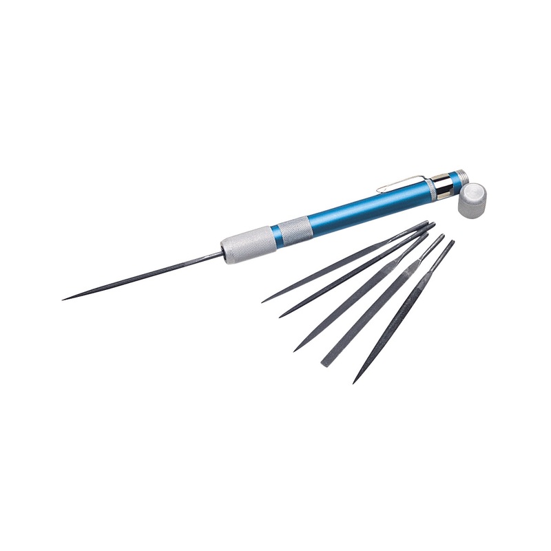 6 Piece File Set - 140 mm Cut to FitThis file set includes six different shapes all cut 2, 5-1/2" files with handles shortened so that they conveniently store in the handle. With a handy, non-roll pocket clip and aluminum anodized handle, you can carry the