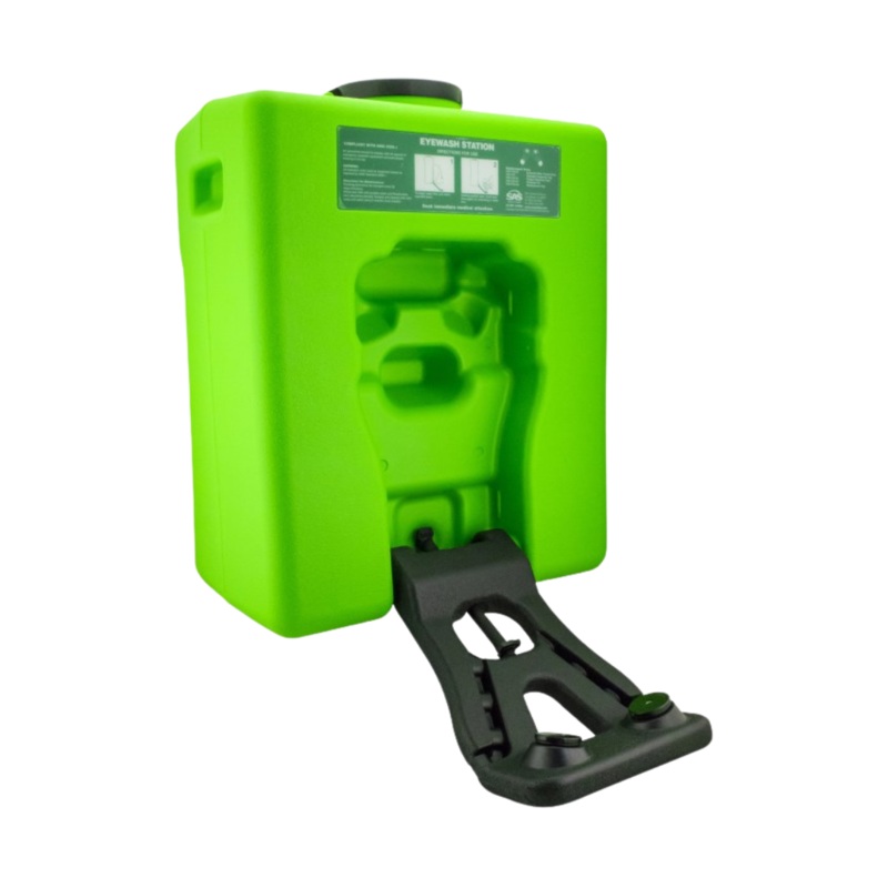Change water every 3-6 monthsCompliance - ANSI Z358.1-2014Holds 9.65 gallons of waterLockable capOne-hand operationPortable unit measures 20.15" x 16.5" x 9.5"Provides a minimum 15-minutes flushing period