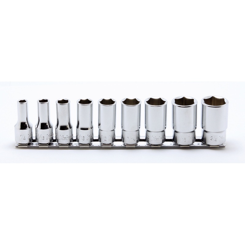 The Ko-ken RS3300XA/9 is a 9-piece 3/8" square drive semi-deep chrome SAE socket set with 6-point openings for a strong grip on fasteners. It includes sizes ranging from 1/4" to 3/4", specifically 1/4", 5/16", 3/8", 7/16", 1/2", 9/16", 5/8", 11/16", and 3/