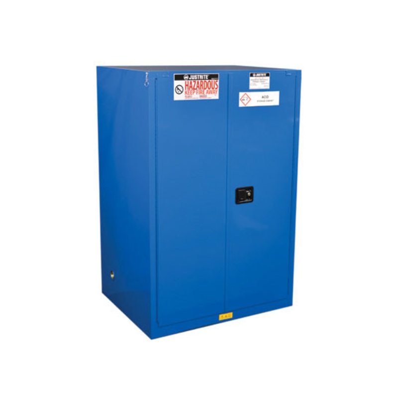JustriteHazardous MaterialSafetyCabinets have the same quality safety features as the cabinets for flammables. All models come with double-wall construction, dual vents, grounding wire connections, adjustable shelves, leakproof sills, three-point self-latching doors and leveling feet. Self-close door(s) shuts and latches automatically when a fusible link melts at 165F (74C) under fire conditions. Unique, concealed self-closing mechanism offers obstruction-free access to contents.