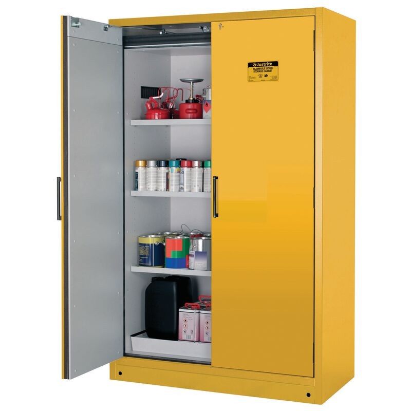 Hybrid style doors open or close manually and include a damper that adjusts the force needed to move the doors. In the event of a fire, the built-in fusible link system releases to allow automatic closure of doors at 122F (50C). Cabinets are EN compliant, FM-approved and meet NFPA 30, NFPA 1, and OSHA standards.