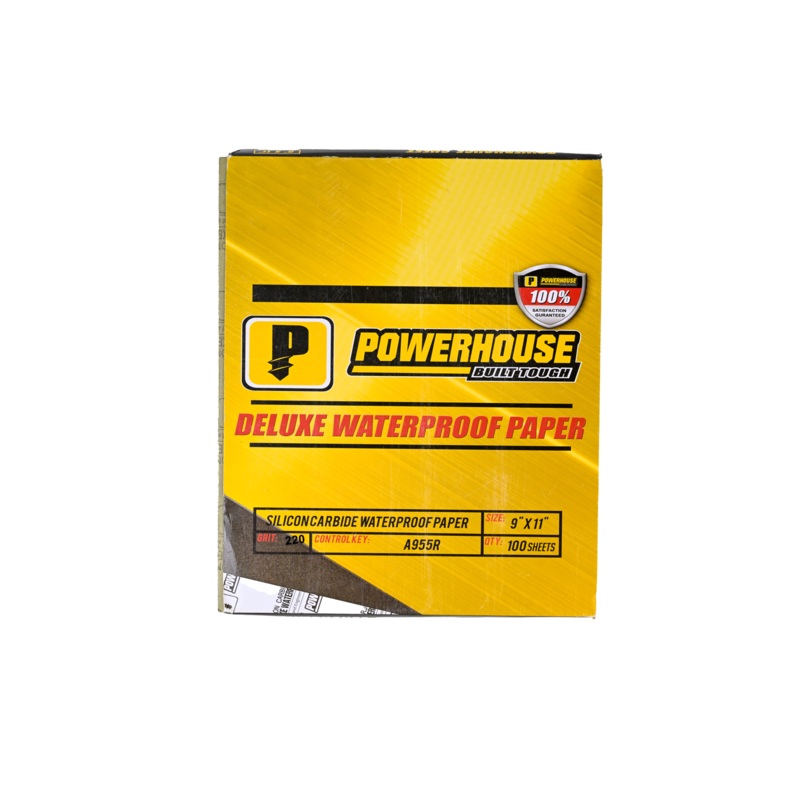 Perfect for wet sanding! Powerhouse Waterproof Sanding Paper #220 (9×11″, Silicon Carbide) for fine grinding on wood, paint & plastics. Get yours today!