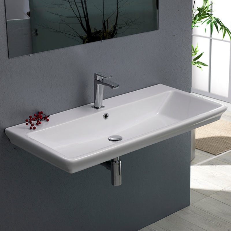 Crafted out of beautiful white ceramic, this rectangle wall mounted or self rimming sink comes with either one or three faucet holes. It’s design is suited for contemporary or modern design bathrooms, and provides enough sink space for any bathroom.