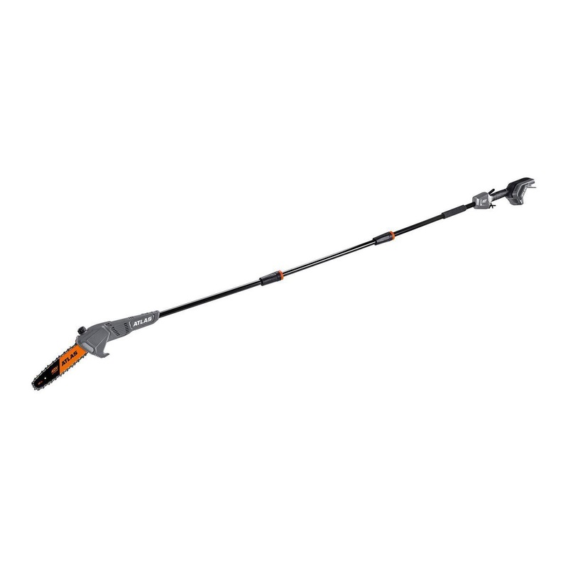 The ATLAS 40V Cordless 10 in. Pole Saw extends to 9 ft. for up to 15 ft. overhead reach, making it easy to prune and limb high branches. The angled head offers precision control and effortless cutting while the built-in branch hook makes it easy to pull out cut branches. An integrated forearm rest prevents fatigue while working overhead. The ATLAS 40V battery platform performs better than gas – no dangerous fumes, no gas and oil mixing, no engine maintenance. All 40V ATLAS tools can be powered by the 40V or 80V battery platforms. Part of the ATLAS 40V/80V battery system, with more flexibility to build out your stable of outdoor power equipment.