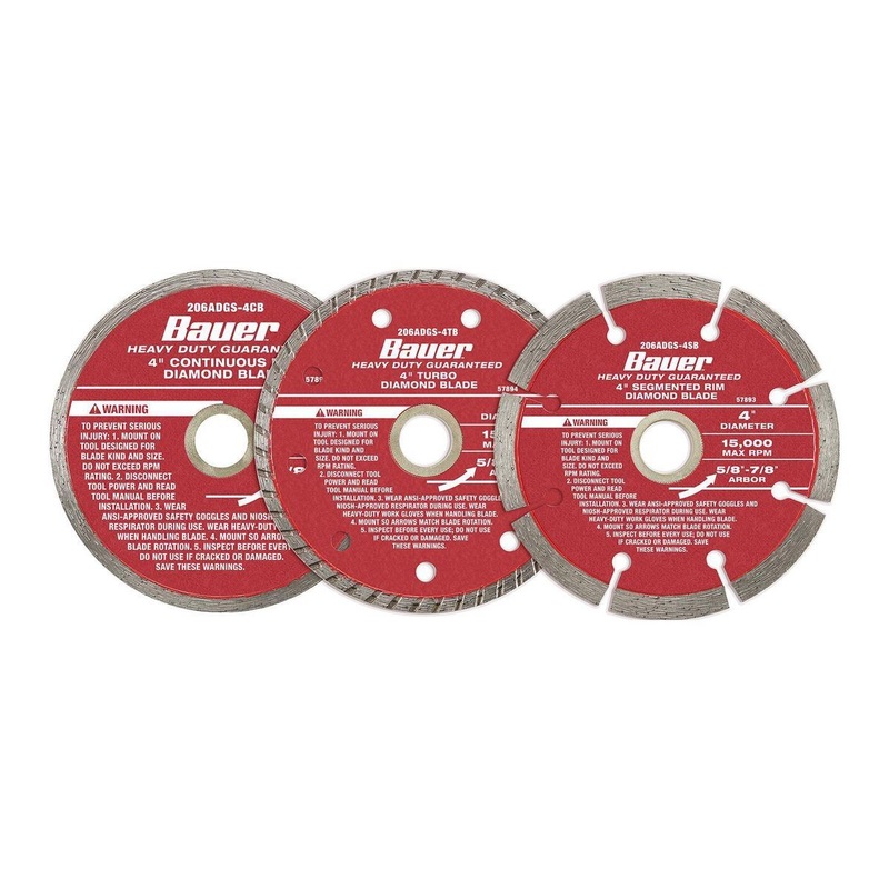 BAUER long-lasting diamond blades are designed to efficiently and cleanly cut a wide variety of materials. The high grade diamond rim combined with a premium bond matrix provides long lasting performance cut after cut. The segmented and turbo blades can be used wet or dry while the continuous rim is wet only. The 5/8 in. and 7/8 in. arbor fits either tile saws or angle grinders.