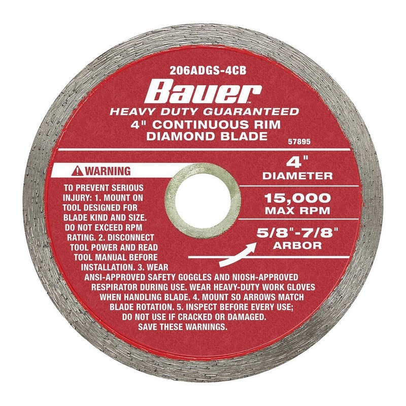 The BAUER 4 in. Continuous Rim Wet Cut Diamond Saw Blade is ideal for general purpose cutting of brick, concrete, masonry, stone, stucco, and tile. The continuous rim design stays in constant contact with the material, delivering precise clean cuts. High g