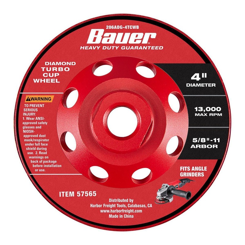 The BAUER Diamond Turbo Cup Wheel is designed for use with 4 in. angle grinders to power through project after project. This wheel is rated for a max speed of up to 13,000 RPM to handle demanding grinding and leveling jobs. Can be used with a dust shroud f