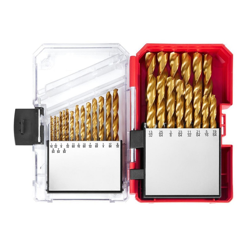 This BAUER Titanium High-Speed Steel Index Drill Bit Set features bits made from precision-machined hardened high-speed steel with a durable titanium coating for improved performance and up to 5X longer bit life.* These bits are ideal for drilling through wood, mild steel, aluminum, brass, and plastic. The set includes bit sizes in 1/64 in. increments from 1/16 in. to 1/2 in.