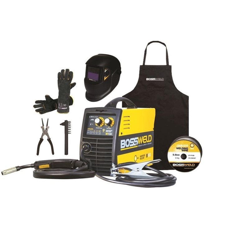 Bossweld Mig M100 READY TO WELD KIT SP610050Everything you need to start weldingBOSSWELD M100 MIG Welder Starter Kit Comprising Electronic Welding Helmet, Leather Gloves, Apron, 0.5kg Welding Wire, Pliers, Chipping Hammer12 Months Warranty