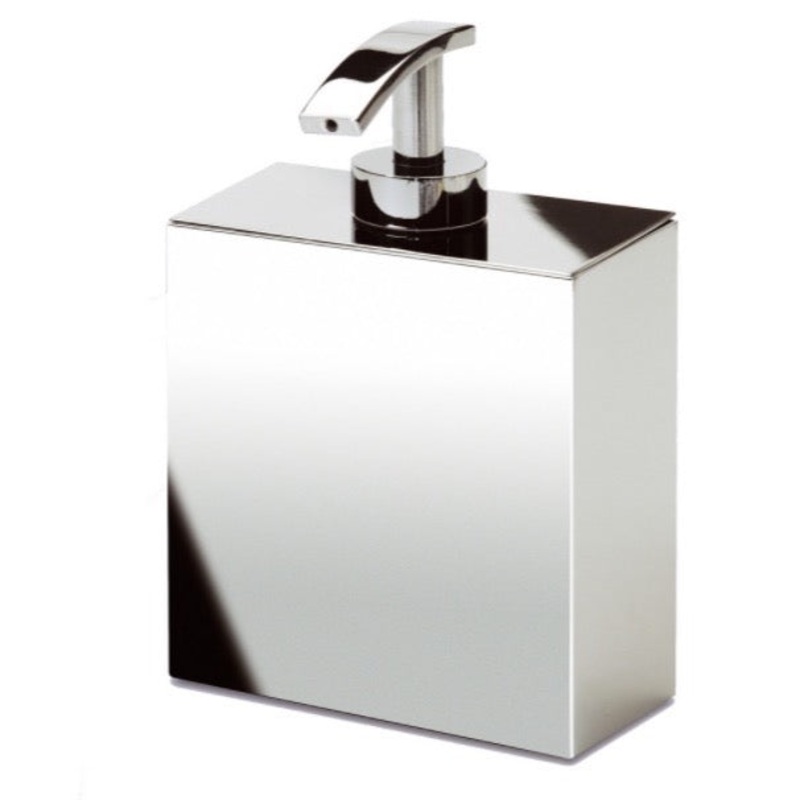 This sturdy, gleaming box-shaped soap dispenser from Windisch shines in its chrome and satin nickel finishes; as an added bonus, its large squared shape and D:2.4" x 4" x H:5.9" dimensions render it capable of holding a whole lot of soap.Contemporary count