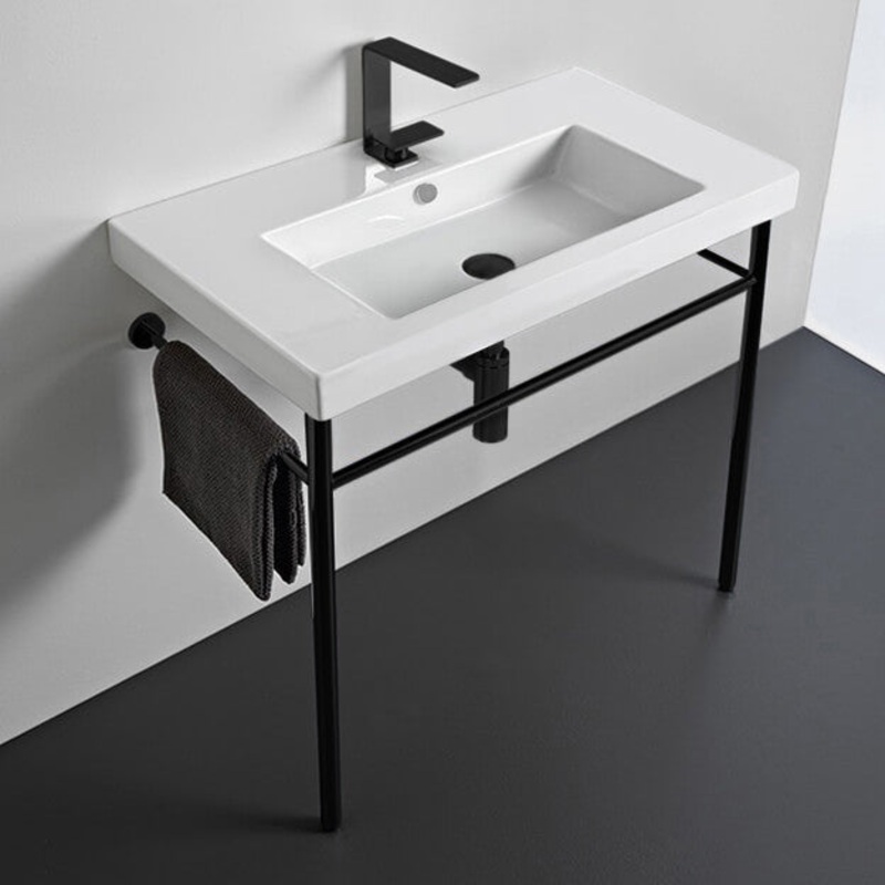 Modern style white ceramic bathroom sink and matte black stand. Stand is made of high-quality brass in a matte black finish. Bathroom sink has faucet hole options of one hole, no hole, or three hole and includes an overflow. Made in Italy by Tecla.Rectangu