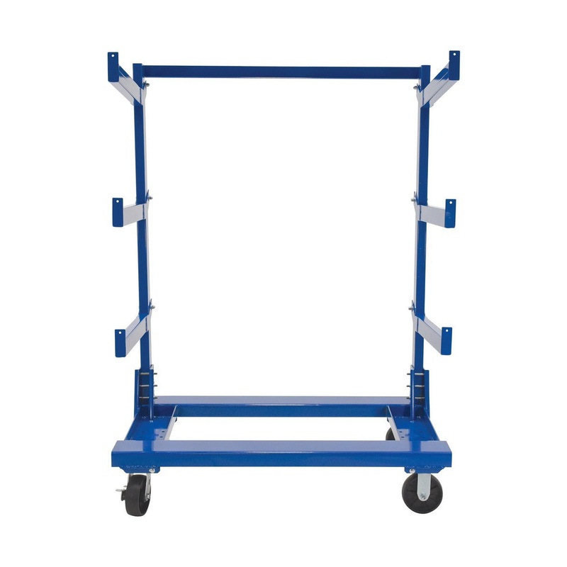 Portable Cantilever Cart for storage of bar stock type items. Each cart includes three pairs of arms. Arm height is adjustable in 6" increments. Arms are secured to cart with a bolt and nut and each arm features two holes so that it may be attached in the