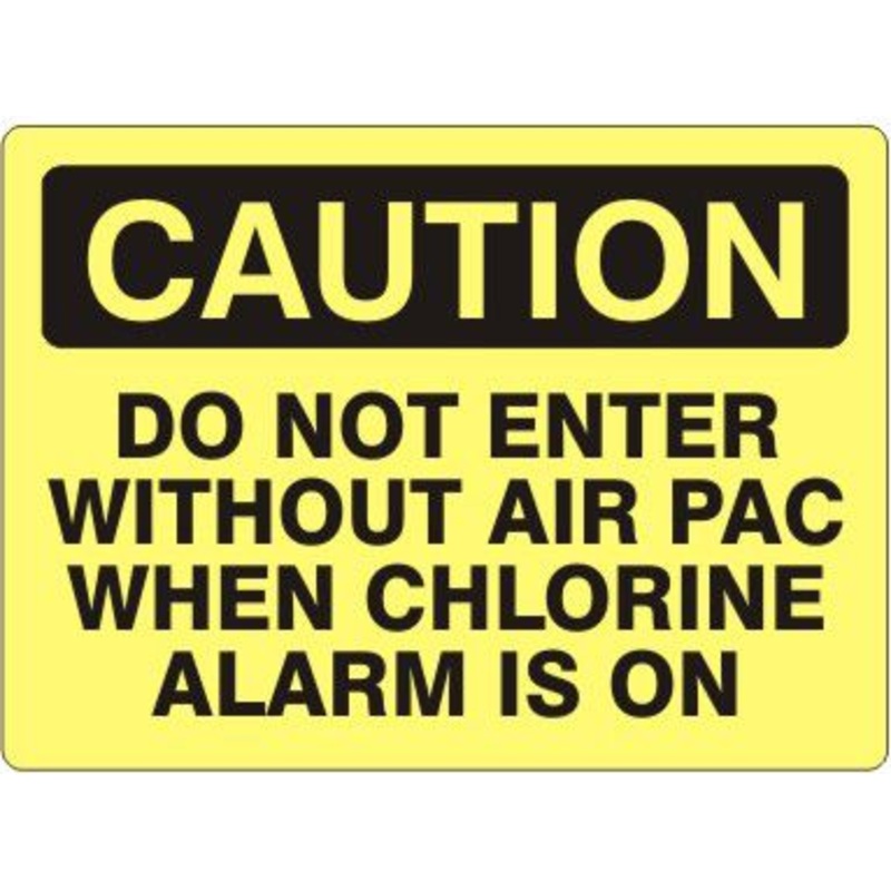 Caution Do Not Enter Without Air Pac When Chlorine Alarm Is On Label, Adhesive Vinyl, Black/Yellow, 14x20"