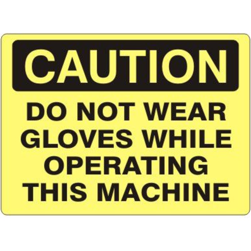 Caution Do Not Wear Gloves While Operating This Machine Sign, Aluminum .040, Black/Yellow, 7x10\