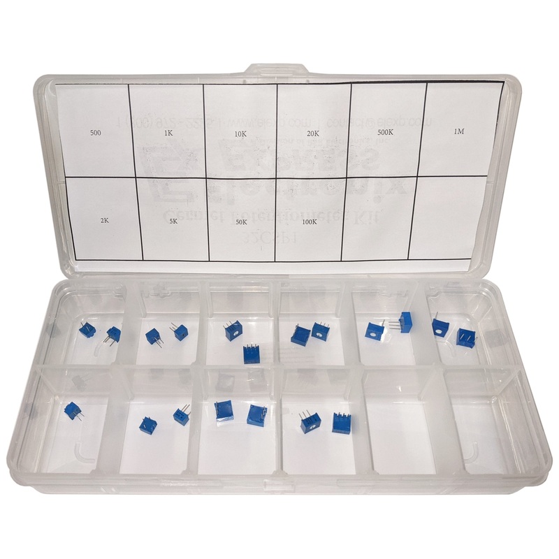 Assortment of 10 different values from 500Ohms to 1MOhms.Total of 20 pieces in a plastic box with dividers.500 Ohms, 1K Ohms, 2K Ohms, 5K Ohms, 10K Ohms, 20K Ohms, 50K Ohms, 100KOhms, 500K Ohms, 1M Ohms
