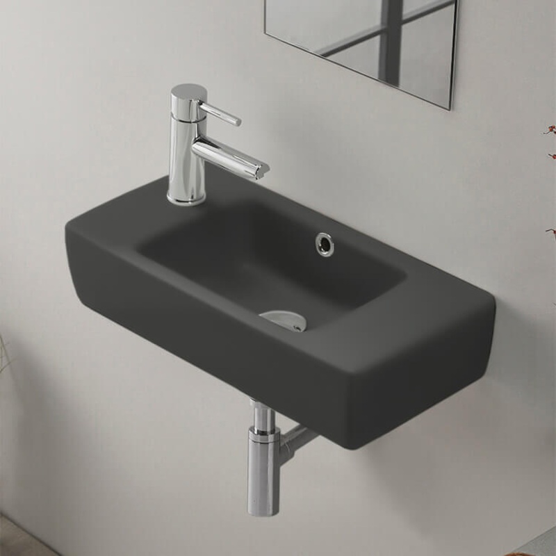 19.7" of modern, sleek self-rimming or wall mounted bathroom sink. Sink includes one faucet hole on the left side of the sink and an overflow. This beautiful, space saving bathroom sink is made of high-quality matte black ceramic.Rectangular matte black ce
