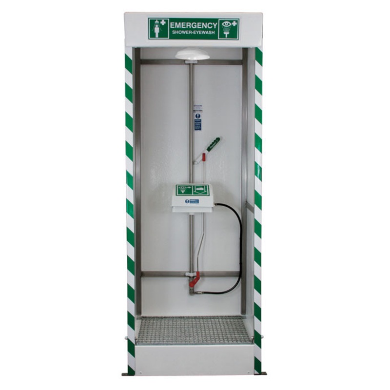 Designed for locations where space is at a premium or the emergency safety shower needs to be enclosed, this all-in-one ANSI-compliant combination cubicle shower and eye/face wash helps prevent overspray and is activated by hand upon entry. The cubicle shower has a stainless steel hollow section frame enclosed in GRP sheeting with stainless steel pipes for corrosion resistance and extended life. The exterior sheeting includes universal pictogram signs and green and white safety stripes.