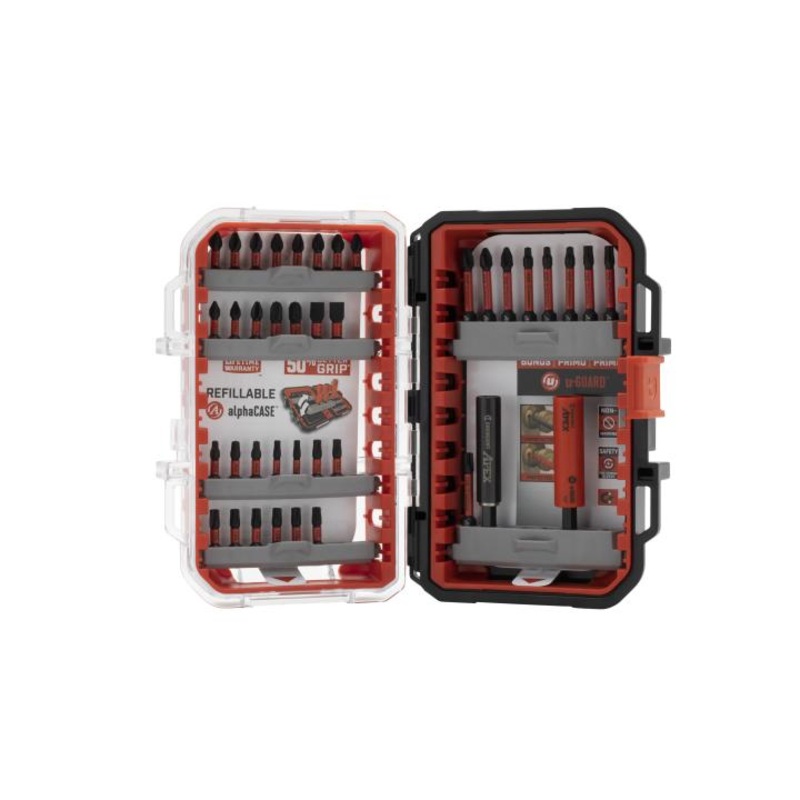 The Crescent 38-piece fastening set is built for the most demanding jobsites. The stack and store alphaCASE features a tongue and groove design with thick sidewall construction. The 38-piece set includes a bonus Crescent patented non-marring u-GUARD covered bit holder which protect final finishes from damage, and the Crescent VORTEX line of torsion bits with optimized tip geometry for fit to the fastener. Screwdriving bit tips include Square, Phillips, Torx, Slotted. Bits are secured in pivoting insert rails inside the case, allowing easy access to bits and case configurability.